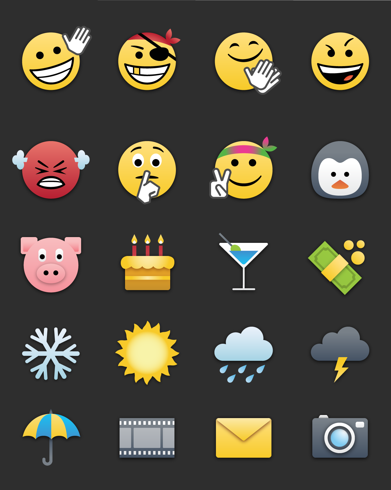 Emoticons I also contributed to the design and update of BB10 emoticons. My role was to double the number of emoticons from the previous BB7 set for the 2013 update.