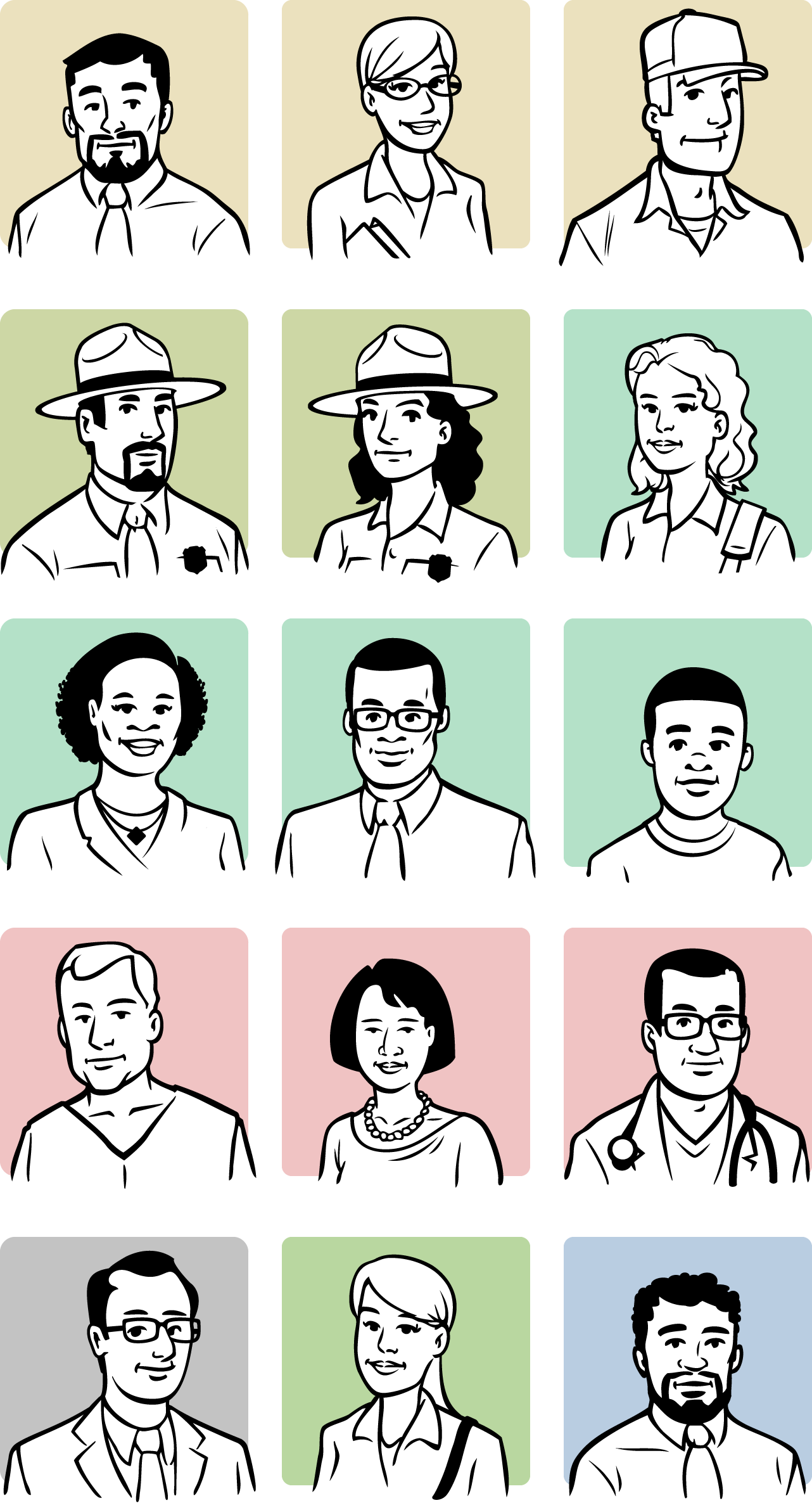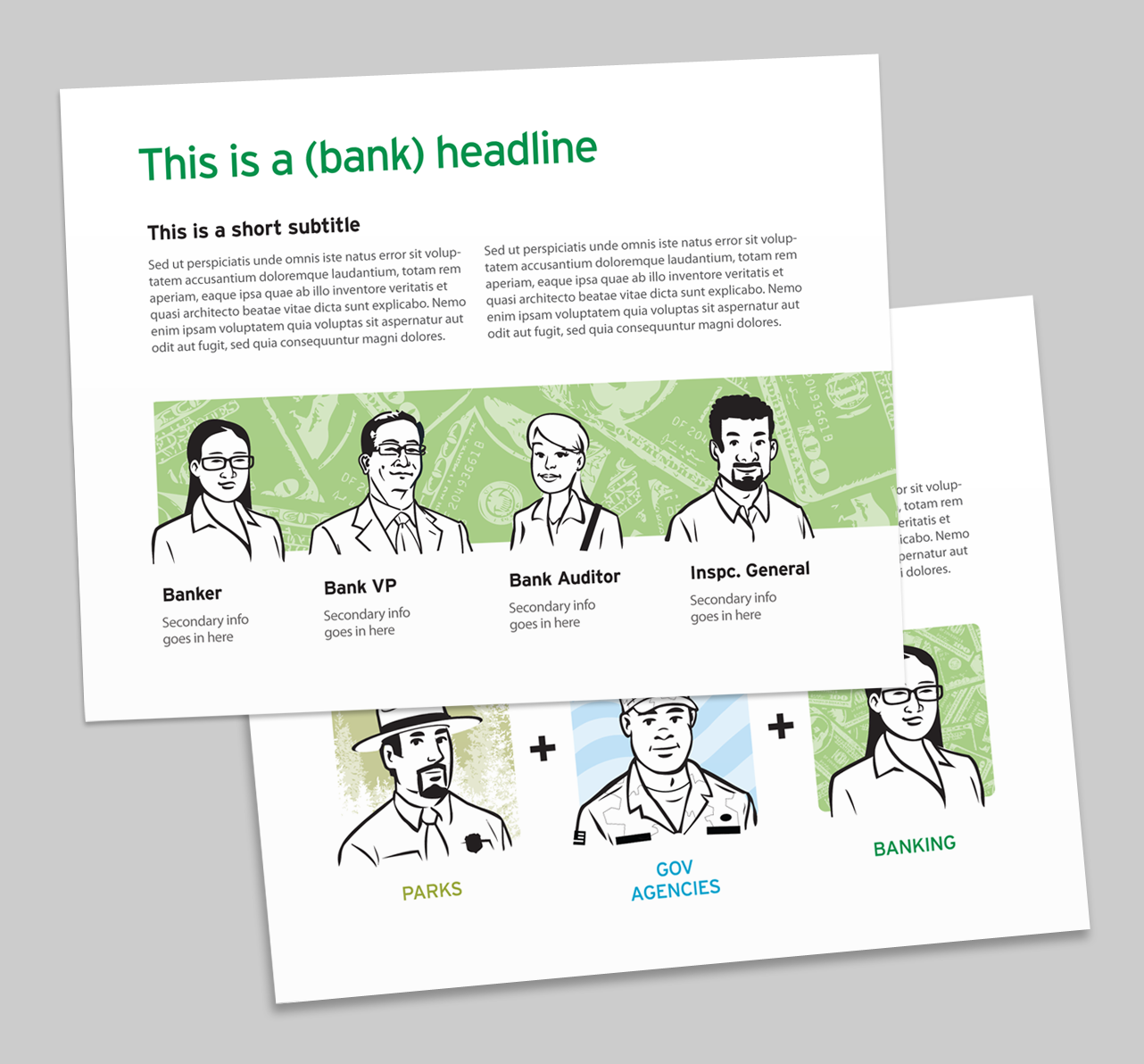 Keystone icons, at top, are designed to visually stand apart from the characters, and each graphic can be repurposed as a background / backdrop effect for the characters (review PPT template).