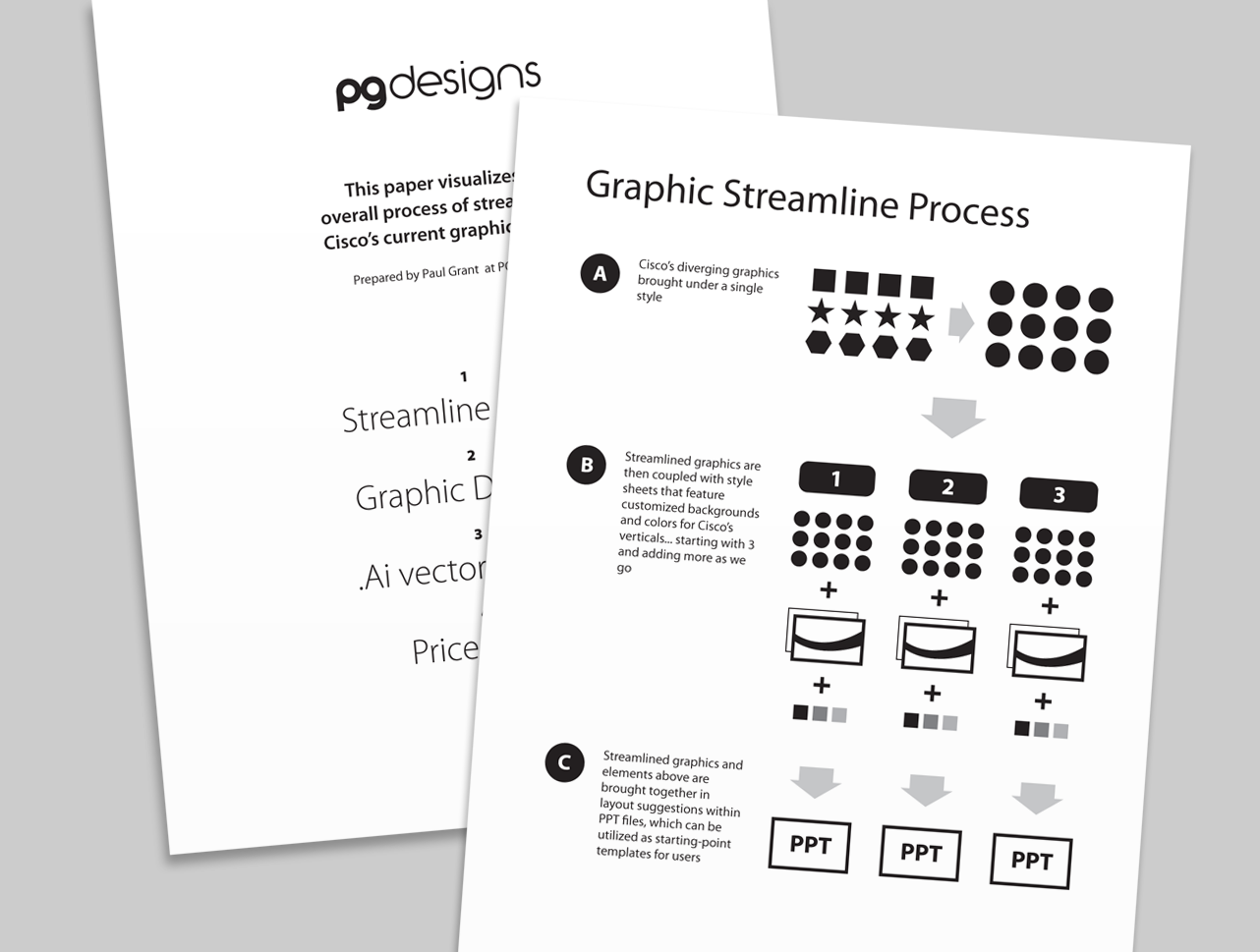 After discussing the details of the task with Cisco, it was determined they wanted to homogenize character styles, expand the collection to 100+ across 9 verticals and create easy drag-and-drop files for use in PPT and Word templates. My project bid PDF included an infographic of the steps to take, to help clarify (last graphic).